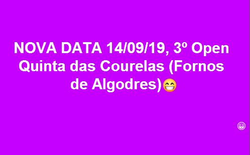 Após conversa no dia 19-10-2019 com o Sr Paulo Menano da organização do 3º Open Quinta das COURELAS (Fornos de Algodres) ficou decidido que em 2019 (e após 4 tentativas falhadas por causa do mau tempo) já não iremos realizar o 3º Open Quinta das COURELAS (Fornos de Algodres), ficando o mesmo para 2020, se o tempo ajudar.